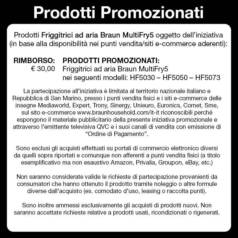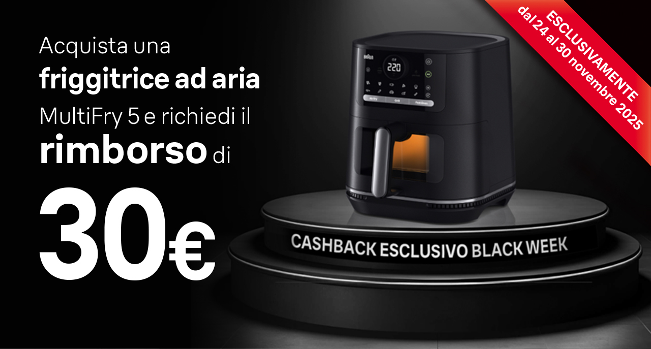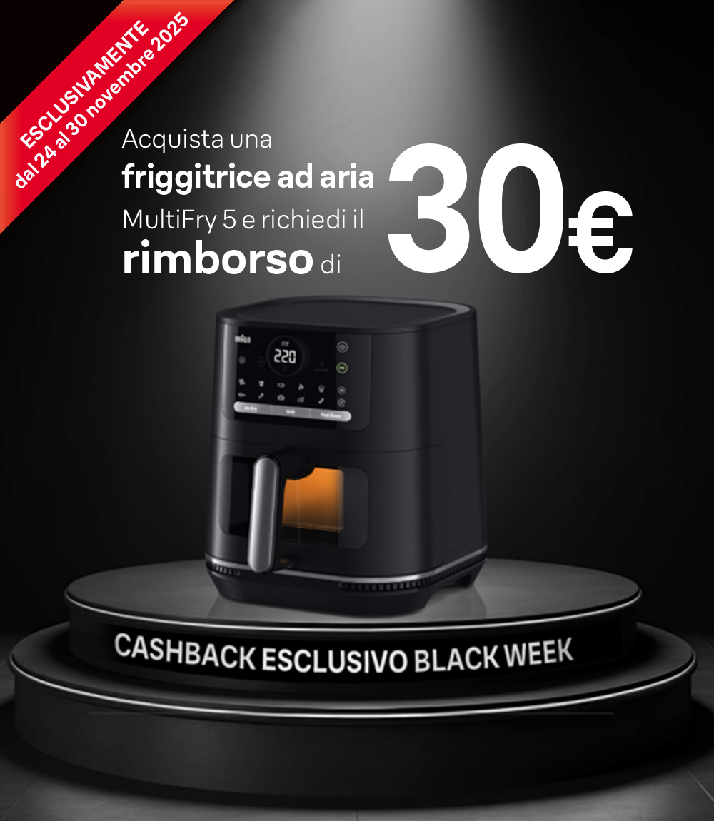 acquista una Friggitrice ad aria MultiFry5 Braun tra quelle promozionate [VEDI I MODELLI] e conserva lo scontrino con la confezione del prodotto.